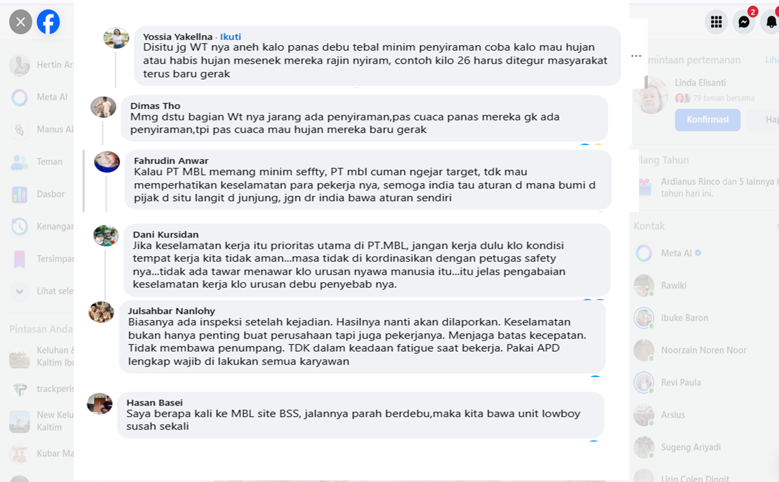 Tangkapan layar komentar warganet di grup Facebook Info Kubar yang menyoroti kondisi jalan hauling di area operasional PT Manoor Bulant Lestari (MBL), terutama terkait kabut debu dan minimnya penyiraman saat cuaca panas. Unggahan ini mencuat usai insiden kecelakaan fatal yang menewaskan dua pekerja, Sabtu (28/3/2026). (Foto: Screenshot Facebook/https://www.facebook.com/share/p/1PJ44SinaY/Trackperistiwa.com)